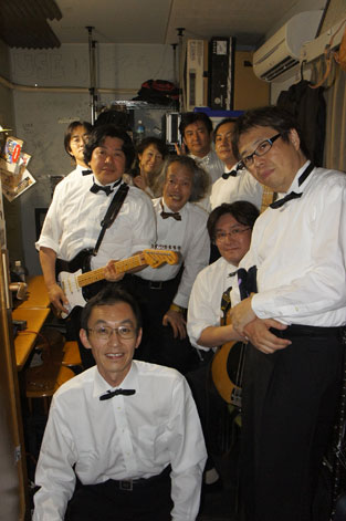 Photo by Pee & Parオープニングは”The Farmers”さん。 3ピースでオリジナル曲。 「おーめー、おーめー、おーめーーーーだれだよーー!」 聞いた後30分は脳内LOOPしてました。 ![]() 2番目は”吉田まぎ”さん。 アコギ一本でのオリジナル曲。力強い!! とここで衣装へ着替えとスタンバイの為、我々は楽屋へ。 昨今の省電力自主規制でエアコン効いてんだか効いてないんだか・・・ そこへオッサン8人が一斉に楽屋へ入ります。 一気に室温アーップ! 「早く着替えて脱出・・・!」